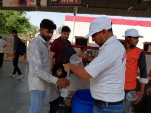 संस्था के सेवक हर डिब्बे की खिड़कियों तक पहुँचे,यात्रियों की खाली बोतलों को भर-भरकर उन्हें राहत पहुँचाई—मानो तपती दोपहर में किसी ने जीवन की ठंडी फुहार दे दी हो।