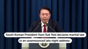 प्रेसिडेंट दक्षिण कोरिया यूं सुक येओल ने टेलीविजन पर देर रात प्रसारित एक अघोषित संबोधन में मार्शल लॉ की घोषणा की,।